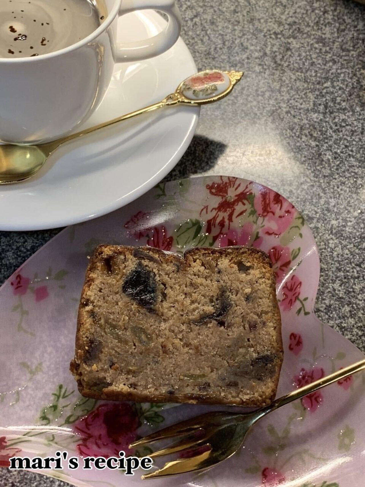 カシス・プルーン・グリーンレーズン・クルミほかドライフルーツがたっぷりと練り込んであります。